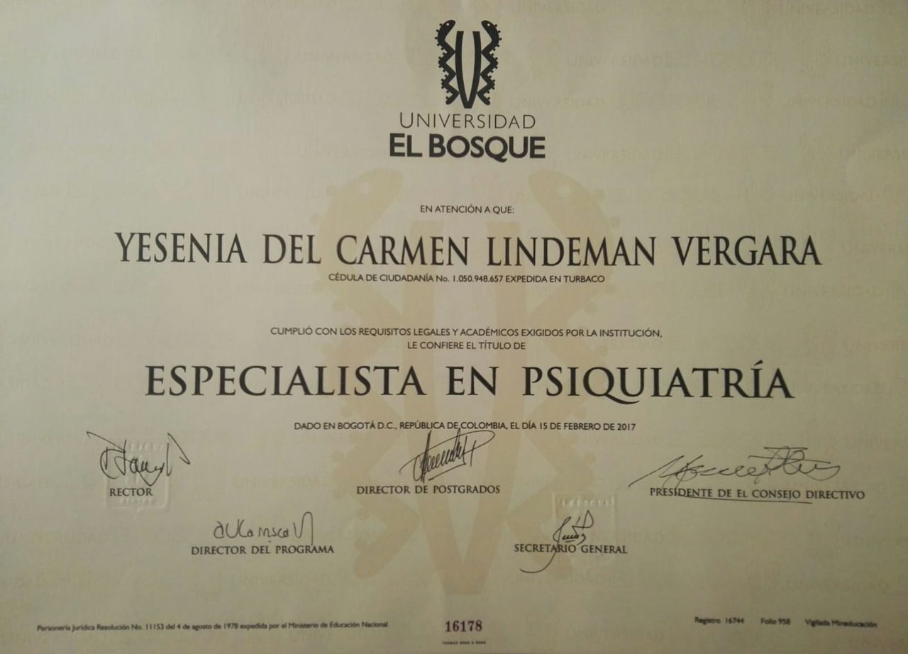 Medico de la Universidad de Cartagena, Psiquiatra de la universidad El Bosque. Interes fundamental en la psicoterapia y el tratamiento del sufrimiento mental. Actualmenten en formacion en psicoanalisis y en master en trastornos de la personalidad.